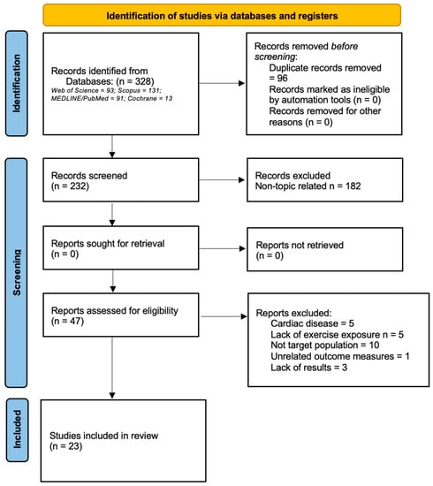 - Cirer-Sastre, R.; Legaz-Arrese, A.; Corbi, F.; George, K.; Nie, J.; Carranza-García, L.E.; Reverter-Masià, J. Cardiac Biomarker Release After Exercise in Healthy Children and Adolescents: A Systematic Review and Meta-Analysis. Pediatr. Exerc. Sci. 2019, 31, 28–36. [Google Scholar] [CrossRef]