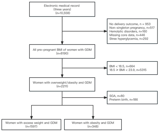 Weight gain and obesity are serious global health problems and independent primary risk factors for gestational diabetes mellitus (GDM) [1]. Women with pre-pregnancy excess weight or obesity may experience increased insulin resistance during pregnancy and exacerbate hyperglycemia, which can be further aggravated by excessive weight gain [2,3]. GDM is primarily diagnosed in the second and third trimesters of pregnancy and is defined as any level of glucose intolerance initially detected during pregnancy [4]. Traditional approaches to GDM management have centered on monitoring and treating it throughout pregnancy to control hyperglycemia in pregnant women. Studies suggest adequate glycemic control in pregnant women can prevent poor outcomes for mothers and neonates [5,6,7]. However, some studies have found that women with excess weight/obesity and blood glucose levels in the normal range have higher large gestational age (LGA) outcomes than women with average or low pre-pregnancy weight [8,9]. Furthermore, excess weight/obesity and GDM may exacerbate adverse neonatal effects, especially the LGA and macrosomia [10,11].