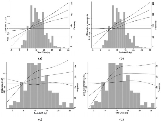 Dose-response relationship between total GWG and risk of LGA and macrosomia. LGA, large for gestational age; GDM, gestational diabetes mellitus; GWG, gestational weight gain; the solid line represents OR; the dotted lines represent the 95% confidence interval (CI); (a,b) for pregnant women with GDM and excess weight; (c,d) for pregnant women with GDM and obesity.