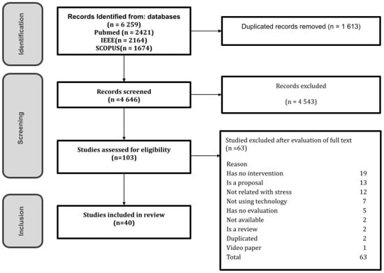 The evaluations of the interventions have been carried out in laboratory settings under controlled conditions, so more evidence gathered in a natural context is needed to conclude about the benefits of these approaches in the long term and their adoption. Also, many studies were excluded due to not reporting intervention evaluations, which indicate that the research interest is growing. Among these studies, several were recent publications presenting designs of wearable devices embedded in clothing, i.e., wearable garments [91,92,93,94,95]. Similarly, we identified some preliminary research works proposing novel technologies to detect other stress information sources, such as cortisol and repetitive body movements in legs and fingers [96]. Therefore, further reviews may be needed in the near future to map the research on novel developments in this topic.