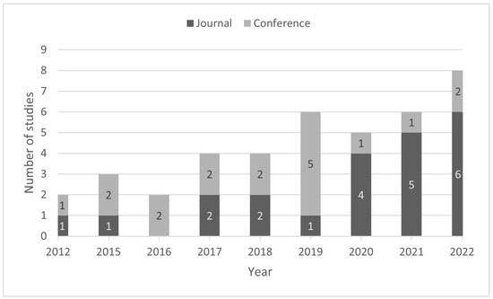 Figure 2 illustrates a stacked bar chart that depicts the number of conference and journal articles identified per year. The graph reveals an upward trend in the number of studies over the last four years of the analyzed period (2019–2022), during which more than half of the studies (N = 25, 62.5%) were published. Furthermore, there were more studies published in journals (N = 22, 55%) than in conference proceedings (N = 18, 45%). Notably, journal publications dominated in the last two years compared to previous years (N = 11).