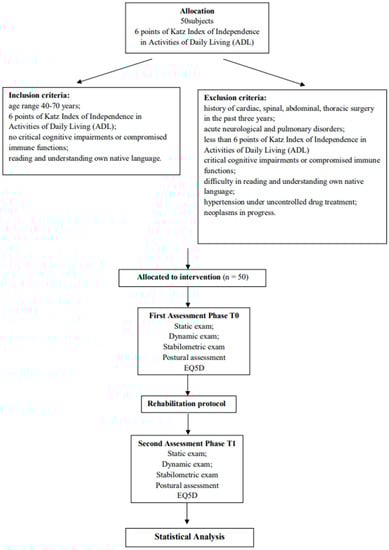 To measure the effects of good support on postural balance, in this study, we used biomechanical postural evaluation to evaluate individuals. This study aimed to determine the effectiveness of thermal care in combination with physiotherapy in individuals with a basic level of independence [7,9]. We hypothesize that good balance is fundamental for achieving and maintaining autonomy and that autonomy is crucial for living independently and improving quality of life [10]. Multimodal approaches could determine postural imbalance, especially in subjects with basic autonomy. Overall, the aim of this study was to evaluate effects of integrated thermal rehabilitation care (ITRC) on postural balance and, consequently, health-related quality of life in subjects with basic autonomy. Moreover, we would like to assess integrated approaches as a new way to treat individuals with reduced autonomy due to specific pathological pathways [8,11].
