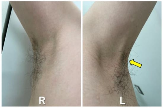 Bilateral axillae at the time of examination. A cord-like structure is observed in the left axilla (yellow arrow). R indicates right axillae, and L indicates left axillae.