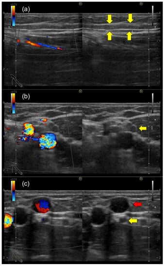 Ultrasound image of the left axillary region during an outpatient visit: (a) sagittal ultrasound image of the axilla; (b) axial ultrasound image of the axilla (hypoechogenic luminal structures and hyperechogenic walls are seen (yellow arrow)); (c) ultrasound image of the left elbow, where venous blood sampling was performed. The cord-like structure (yellow arrow) is observed as a hypoechoic luminal structure on US examination of the left axilla, extending from the left axilla to just below the ulnar cutaneous vein (red arrow) from which the blood was drawn.