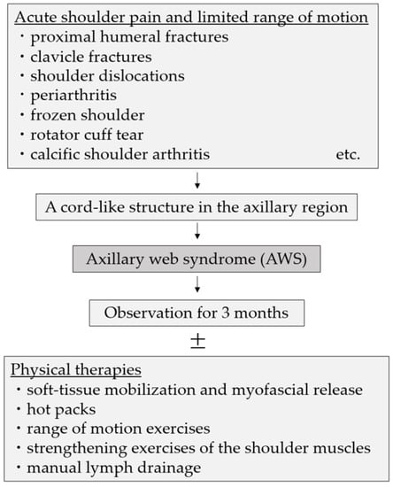 A clinical algorithm regarding the diagnostic and therapy of AWS is presented (Figure 4). Listing AWS as a differential condition between acute shoulder pain and limited range of motion is challenging. However, AWS can be caused by minor lymphatic injuries due to venous blood sampling or even minor trauma or physical activity, so the prevalence of AWS is likely to be higher than it should be. Clinicians need to recognize AWS because its characteristic physical findings directly relate to the diagnosis. It is also important to understand that AWS can occur other than after axillary surgery and to take appropriate physical examination findings. Due to its low recognition, the diagnosis may be missed and misdiagnosed as unexplained shoulder pain, such as periarthritis or frozen shoulder. Appropriate diagnosis of AWS will reduce unnecessary medical costs due to excessive testing and provide adequate informed consent to the patient. In addition, physical therapy treatment options may be offered to improve shoulder pain and range of motion and prevent prolongation of shoulder pain.