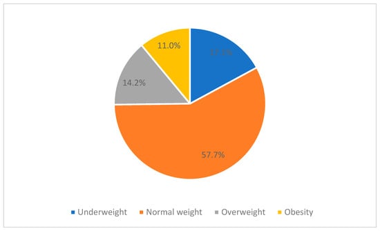 This study categorized BMI subgroups based on the suggestions of the Regional Office for the Western Pacific of the World Health Organization [] (Table 1). The prevalence rates of underweight, overweight, and obesity were 17.1%, 14.2%, and 11.0%, respectively, while the rate of normal weight was 57.7% (Figure 1). Most participants (81.9%) had weight management experience. Among 56 participants (18.1%) without weight management experience, the number of underweight, normal weight, overweight, and obesity were 31, 19, 2, and 4, respectively. The median self-reported BMI was 20.83 kg/m2; the median expected BMI was 18.37 kg/m2. Wilcoxon signed-rank test examined the difference between self-reported and expected BMI. The difference was significant (Z = −14.21, p < 0.001); the participants hoped to have a lower BMI.