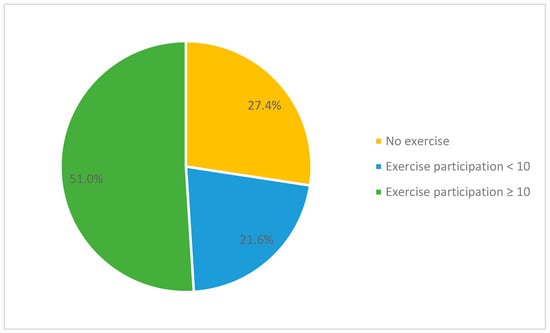 Exercise participation was insignificantly different among BMI subgroups. However, compared with the median of 10 in exercise participation among 310 participants (Table 2), the underweight and obese group needed more exercise. Considering its interquartile ranges among all BMI subgroups (Table 4), we further categorized the participants’ scores on exercise participation (Figure 2); 49% of the participants scored 0 to 9 in exercise participation. Although exercise might not play an essential role in causing increased BMI or body weight among young college students [,], it helps individuals maintain or improve fasting blood sugar, blood pressure, and cholesterols within normal limits, even though they are obese [].