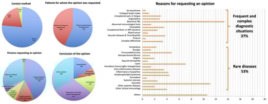 The opinions concerned patients already followed up in our Department in 57% of cases. The reasons for seeking an opinion were very varied, but could be grouped into two situations: diagnostic or therapeutic management of rare diseases (e.g., systemic sclerosis, vasculitis, systemic lupus erythematosus and complications of immunosuppression) in 53% of cases, and management of frequent complex diagnostic situations (e.g., unexplained asthenia/pain, chronic fever of unknown origin, non-inflammatory vascular disease/thrombophilia, angio-œdema) in 37% of cases.