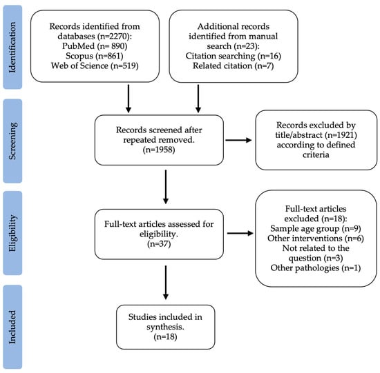 The first search carried out was on the gut microbiota of overweight or obese children in comparison to the gut microbiota of normal weight children, according to previously defined criteria. The literature search identified a total of 2270 potentially relevant articles (PubMed: 890; Scopus: 861; Web of Science: 519). This search was supplemented with 23 studies from “related citations” and a manual search of reference lists. After removing repeated articles, 1958 were considered for assessment. From this, 1921 were excluded by title or abstract. This way, 37 articles were selected for full-text review. Ten were not related to the question, and nine were excluded because the age group did not match the research. An overall of 18 studies that fulfilled the inclusion criteria were considered in this systematic review for qualitative analysis. The selection process of the included studies is summarized in Figure 1.