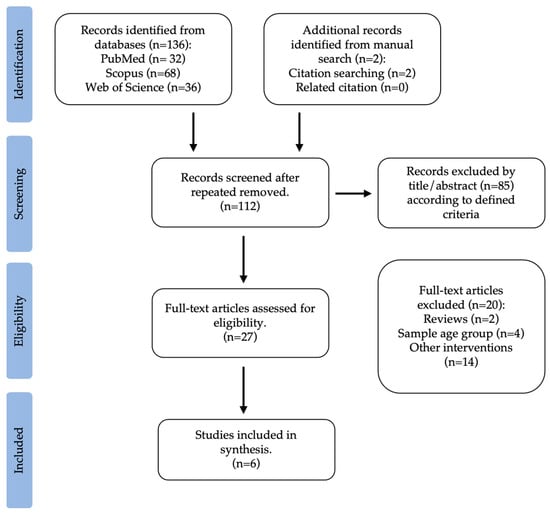 The second search carried out was on interventions with physical activity and their impact on the gut microbiota of overweight and obese children and adolescents, according to previously defined criteria. The literature search provided a total of 136 original citations (PubMed: 32; Scopus: 68; Web of Science: 36). This search was supplemented with two studies from a manual search of reference lists. After removing repeated articles, 112 were considered for assessment. From this, 85 were excluded by title and abstract. This way, 27 articles, chosen based on the title and abstract, underwent a comprehensive full-text review. Two were reviews, four were excluded because the age group did not match the research, and fifteen were related to other questions (e.g., environment, diet, preconception, geography, or diseases). Lastly, an overall of six studies were selected, according to previously defined reasons, whose objective was to explore the connection between childhood obesity, physical activity, and gut microbiota. Figure 2 illustrates the selection process for this systematic review.