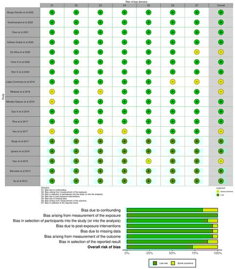 For the first search, the “measurement of exposure” was judged as low risk in 100% of the studies. For most of the studies (n = 17) the “post-exposure interventions”, “missing data”, and the “measurement of the outcome” domains were judged as having a low risk of selection of bias (94.4%), with one study being judged as having some concerns. For most of the studies (n = 16), the “selection of participants into the study (or into the analysis)” and the “selection of the reported result” domains were judged as low risk of selection of bias (88.9%), with two studies being judged as some concerns. For most of the studies (n = 15), the “confounding” domain was judged as having a low risk of selection of bias (83.3%), with three studies being judged as having some concerns. A total of thirteen studies were judged as low risk in the overall risk of bias (72.2%) and five studies as some concerns (27.8%). No studies were judged with high risk or very high risk of bias for each domain. Figure 3 illustrates the robvis tool [60] risk of bias assessment for the articles selected in the first search.