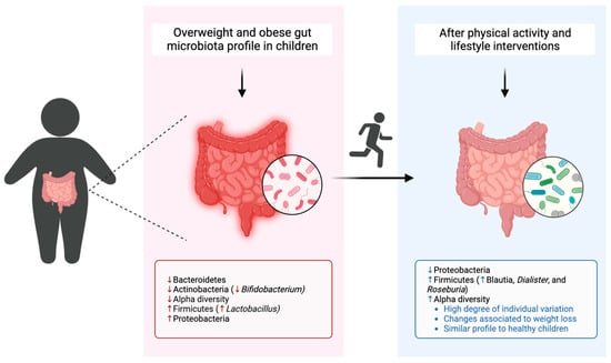 Gut microbiota composition of children with overweight and obesity in comparison to healthy children and modulation after physical activity interventions. Created with BioRender.com (https://app.biorender.com/ (accessed on 11 July 2023)).