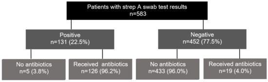 - Mantzourani, E.; Cannings-John, R.; Evans, A.; Ahmed, H. To swab or not to swab? Using point-of-care tests to detect Group A Streptococcus infections as part of a Sore Throat Test and Treat service in community pharmacy. J. Antimicrob. Chemother. 2022, 77, 803–806. [Google Scholar] [CrossRef]