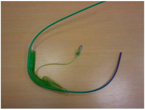 The ProSeal LMA (pLMA, Teleflex Incorporated, Wayne, PA, USA) tube is soft and can bend during insertion, making placement difficult. The insertion of this supraglottic airway guided by a gum elastic bougie is associated with a higher success rate compared to the standard digital technique and the introducer technique; thus, this method is well described in the literature [,,]. Second-generation LMAs are anatomically shaped and curved and the ventilation channel material is more robust. These features facilitate insertions with classical techniques. However, they may also benefit from a bougie-assisted or catheter-assisted technique when the insertion is difficult, solving the problem. Therefore, it is worth remembering this technique. There are at least two possible bougie-assisted laryngeal mask insertion techniques. The first one consists of introducing the distal end of the bougie into the esophagus blindly or with the use of a laryngoscope. Subsequently, its proximal tip is inserted into the distal tip of the laryngeal mask suction channel. The laryngeal mask is then inserted into the pharynx following the bougie as a guide wire. The second technique involves placing the bougie in the suction channel of the laryngeal mask so that most of the length of the bougie is outside the distal tip of the laryngeal mask before inserting it into the patient’s mouth. Subsequently, the distal tip of the bougie is inserted into the esophagus to “railroad” the laryngeal mask onto the introducer (Figure 2). The authors used a gastric catheter-assisted insertion of a laryngeal mask (Figure 3). The gastric catheter is inserted into the gastric channel of the laryngeal mask prior to mask placement. The gastric catheter is inserted in the esophagus of the patient and the laryngeal mask follows the catheter as a “guide wire”. The additional advantage of this technique may also be the immediate evacuation of air from gastric insufflation after the insertion of the laryngeal mask.