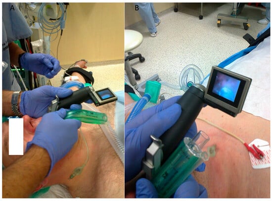 In a similar fashion, the combined use of video laryngoscopes optimizes the positioning of the laryngeal mask. This confers an increase in the sealing pressure and a decrease in complications [,]. The technique of the video laryngoscopy-assisted insertion of the laryngeal mask is similar to video laryngoscopy tracheal intubation. The video laryngoscope is inserted into the mouth to visualize the entrance to the larynx (Figure 4A). The laryngeal mask is then inserted and the placement of the laryngeal mask cuff is observed in the monitor (Figure 4B).