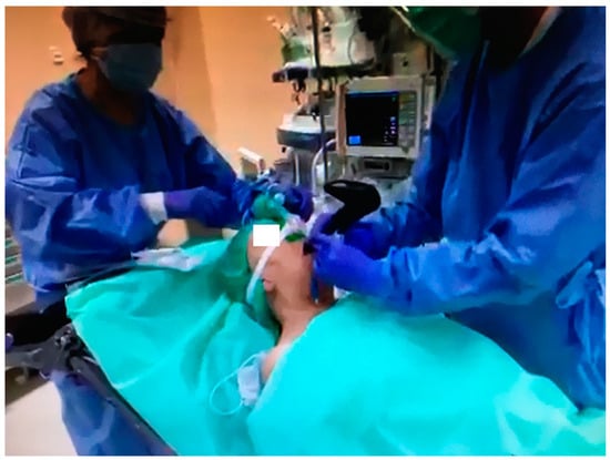 The face-to-face technique, also known as inverse intubation, “Tomahawk,” or “Pickaxe” method, can be employed for patients trapped in a vehicle [] or those with spondylarthrosis []. However, this method requires good experience and should only be used after proper training, such as on a manikin []. Video laryngoscopes and video intubating laryngeal masks can successfully facilitate face-to-face endotracheal intubations [,,,]. There are also publications describing the possibility of using the Macintosh laryngoscope in face-to-face intubations []. Nonetheless, in our opinion, video laryngoscopes are better suited for this technique, achieving higher effectiveness, a shorter intubation time, and convenience for the anesthetist. The inverse intubation can be performed by one person successfully and does not require an assistant (Figure 9) []. The anesthetist, standing on the left side of the patient, can hold the video laryngoscope with their right hand and insert the tube with the left one. Alternatively, they can introduce the device with the left hand (as in the traditional approach) and relocate the video laryngoscope to the right hand after obtaining a satisfactory visualization of the larynx, then insert the intubation tube with the left hand. Channeled video laryngoscopes can also be used for this method, producing good results []. Regardless of the method, a video laryngoscope is undoubtedly a better choice than the traditional Macintosh device.
