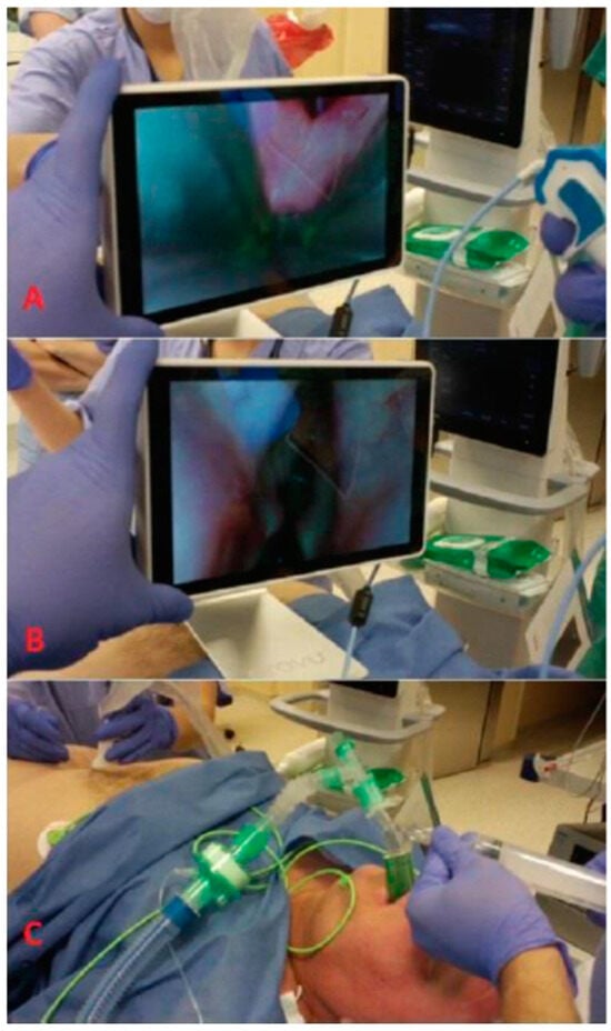 Another interesting approach for addressing the challenges associated with the passage of a tube through the vocal cords during laryngoscopy is the combined use of a laryngoscope and a bronchoscope, known as combined laryngo–bronchoscope intubation (CLBI) [,]. This technique is also commonly referred to as the “smart stylet” technique []. In this method, the bronchoscope is employed to articulate the guide for the endotracheal tube—not for visualizing the glottis. Meanwhile, the laryngoscope or video laryngoscope is utilized to visualize the entrance to the larynx and to direct the bronchoscope toward the glottis (Figure 1).