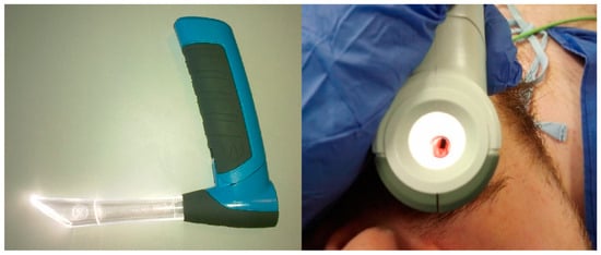 The advantages of modern methods of airway management compared to the traditional approaches are primarily associated with improved safety for patients. For instance, the integration of video laryngoscopes into daily medical practice can lead to a reduction in the complications related to issues, such as unrecognized esophageal intubations [], as well as decreased trauma associated with intubation attempts []. When compared to standard laryngoscopes, video laryngoscopes exhibit a higher rate of first-pass success [,], a crucial factor, particularly in challenging patient cases, such as trauma patients or individuals who rapidly desaturate, such as those with obesity [], obstetrics patients [], and neonates []. However, the widespread adoption of video laryngoscopes in daily practice might provide limitations, notably in terms of costs. Some countries still find it expensive to equip every ambulance with video laryngoscopes. A potential solution to this problem involves the utilization of custom-made video laryngoscopes, as discussed in Section 3.2.2, or the exploration of alternative devices that can enhance the success rate of endotracheal intubations when video laryngoscopy is not available. One such device worth mentioning is the VieScope laryngoscope (Adroit Surgical, Oklahoma City, OK, USA), as depicted in Figure 12. The VieScope represents a novel laryngoscope design, featuring a straight, shielded, and illuminated tube. It was specifically developed for tracheal intubation using a gum elastic bougie and employing the paraglossal technique. Several studies have affirmed the effectiveness of the VieScope laryngoscope in improving the success rate of endotracheal intubation [,,,,,,].