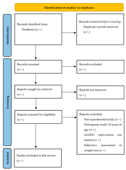 In this section of results, we expect to include information from randomised and non-randomised clinical trials on the characteristics of the 3wCBT most used to facilitate weight loss in the adult population who are overweight or obese. The study selection and screening will be presented in a PRISMA flowchart (Figure 1). We will carry out the synthesis of the studies included in this review in both narrative and tabular forms. Results will be reported in accordance with the Cochrane manual in order to ensure methodological rigor. Once completed, the results of this scoping review will be submitted to a peer-reviewed journal indexed in the Journal Citations Reports (JCR).