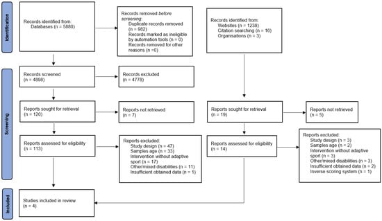 A total of 7137 articles were identified through various search strategies. Specifically, 5880 studies were found in the electronic databases search and 1257 studies were found in other electronic sources (grey literature). After removing duplicates, 4898 items were obtained. The main reasons for exclusion were: (i) the study design, (ii) the age of the samples, (iii) interventions not based on adaptive sports, and (iv) samples without physical disability, or mixing physical disability and visual/cognitive disabilities. Figure 1 presents the flow diagram illustrating the process of study selection. After screening titles and abstracts, 127 studies remained. After reading the full texts, only 27 studies evaluated the influence of adaptive sports practice on health aspects in adults with physical disabilities. Of them, eight primary studies focused on the influence of adaptive sports on physical and mental quality of life in adults with physical disabilities. Four of these primary studies were excluded from the meta-analytic analysis because three of them reported insufficient data [20,21,22] and the evaluation instruments (scales) had an inverse scoring system compared to the rest of the included primary studies [23]. Therefore, four primary studies were finally included in the meta-analytic analyses.