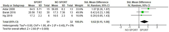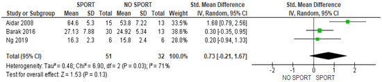 Adaptive sports modalities were different in the primary studies. The experimental intervention by Aidar et al. consisted of aquatic activities and swimming sessions of 45–60 min practiced twice a week for 12 weeks. However, the control condition consisted of not receiving any intervention during the trial [13]. The intervention implemented by Ng et al. involved a ballroom dance program consisting of 1 h sessions twice a week over a period of 6 weeks. The control group did not receive any intervention during the study [14]. Intervention by Jackson et al. consisted of kickboxing practice for 1 h, three times per week for 5 weeks [24]. All participants included in the study by Barak et al. received a multidisciplinary rehabilitation program. In addition, the competitive intervention groups trained boccia three times per week for 1.5 h each time and participated in a strength training program twice a week for 1 h. The recreational intervention group participated in two tactics boccia sessions per week too, but not in the competitions and not in a specific training [15]. The available information about the characteristics of the studies included in the meta-analysis is shown in Table 1.