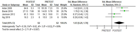 The present meta-analysis shows that the practice of adaptive sports did not have effect on physical quality of life when adaptive sports interventions were compared versus a control group (SMD 0.73; 95% CI, −0.21 to 1.67, p = 0.13, I2 71%) (Figure 2). However, significant differences were found in the pre–post-test analysis (SMD 1.03; 95% CI, 0.29 to 1.78, p = 0.007, I2 69%) (Figure 3).