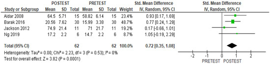 Significant differences were found when adaptive sports practice and control groups were compared. This difference was favorable to the group that practiced adaptive sports (SMD 0.62; 95% CI, 0.15 to 1.08, p = 0.009, I2 0%) (Figure 4). The pre–post-intervention analysis also showed that adaptive sports practice had a positive effect on the mental quality of life (SMD 0.71; 95% CI, 0.35 to 1.08, p = 0.0001, I2 0%) (Figure 5).