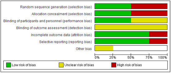 Two of the included primary studies had a high risk of selection bias [13,24] and the other two [14,15] included random allocation. Regarding the “methodological blinding” of the participants and researchers, two primary studies did not collect this information [13,24] so the risk of bias in this aspect is not clear; however, the other two [14,15] showed a low risk. None of the included primary studies reported any information about the detection bias, because the risk of bias is unclearly reported. One of the included primary studies [24] reported a loss of data due to an error in their collection; therefore, it presented a high risk of attrition and reporting bias. On the contrary, the other three included studies presented complete data and they were consistent with the objectives [13,14,15]. In the study by Barak et al. [15] there were other possible biases, which were not possible to assess with precision. On the one hand, great heterogeneity was recognized in the characteristics of the study population. On the other hand, two of the intervention groups performed adaptive sports at a competitive level and the other group at a recreational level. Finally, in terms of the analysis of publication bias, some issues were identified. Despite including all known languages in the search and employing backward and forward search strategies, the limited number of primary studies included in the meta-analysis hinders the meaningful use of funnel plots or other measures to assess this bias effectively. The risk of bias results are depicted in Figure 6 and Figure 7.