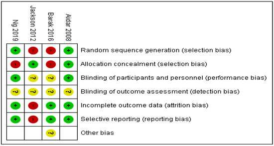 Risk of bias summary: review authors’ judgments about each risk of bias item for each included study [13,14,15,24]. Symbol interpretation: Red (-): high risk of bias; yellow (?): unclear risk of bias; green (+): low risk of bias.