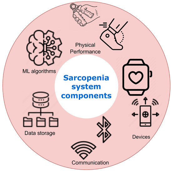 The system seamlessly integrates IoT-enabled devices like scales, blood pressure monitors, and pulse oximeters to regularly collect health parameters. Combined with activity data, these multilayered data provide insights into sarcopenia progression. The data are transmitted to a mobile app for aggregation and preprocessing.