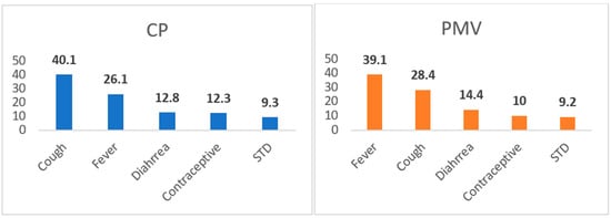 In Figure 1, cough and fever were the most common symptoms presented to CPs and PMVs, respectively.