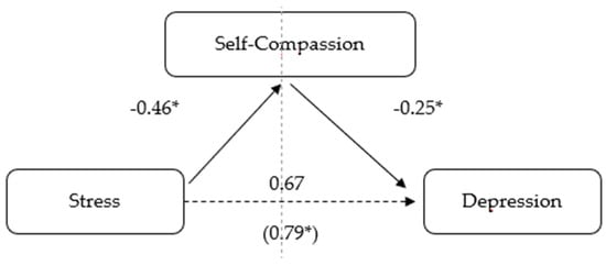 Model of stress as a predictor of depression, mediated by self-compassion. (* p < 0.001).