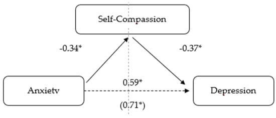 Model of anxiety as a predictor of depression, mediated by self-compassion. (* p < 0.001).