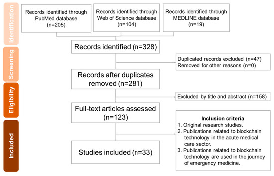 To be eligible for inclusion in this review, papers needed to focus on the application of blockchain technology in the field of acute medicine. The data sources encompassed the Web of Science (WoS), PubMed, and Medline. The search strings were formulated in accordance with the research domain and the specified research questions. The search terms were as follows: