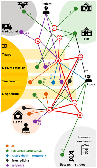 Next, we have created an emergency department journey map (Figure 6) and allocated the “ID Numbers” of selected studies to their respective stages within the journey. The emergency department (ED) map illustrates a patient’s journey, commencing with pre-arrival incidents like car accidents or heart attacks, advancing to pre-hospital care or transfers, followed by the arrival at the emergency entrance for triage, subsequent assessment and treatment, disposition, and ultimately returning home. The inclusion of ID numbers along this pathway signifies the placement and relevance of blockchain applications along the emergency department journey. This aids in providing a clearer comprehension of the current status and potential growth of blockchain applications at different phases of the journey. In the forthcoming discussion, we will delve into the current scenario and future prospects of blockchain applications based on the emergency department journey map. Finally, we will provide examples focused on two distinctive scenarios in emergency medical care: pre-hospital and disposition at home.