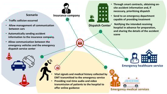 In the application of blockchain, pre-hospital emergency medical care stands out as the most distinctive aspect compared to other specialties. It comprises two major components: emergency medical services (EMS) and inter-hospital transfers (IHTs), with the former being particularly noteworthy. EMS serves a paramount role in preserving human lives and reducing mortality and morbidity rates [89]. Various studies have demonstrated that accurate and early detection by EMS plays a crucial role in timely hospital management and admission for emergencies such as ST-elevation myocardial infarction, acute stroke, and trauma [90]. In the context of EMS, it involves the collection of pre-hospital individual data and assessment results, which may be transmitted to data centers or cloud systems through the internet. These data could be accessed by hospitals or individuals with different needs. Additionally, with the increasing popularity of electronic transmission technologies and social platforms, some social media platforms have been utilized as channels for data transmission, effectively reducing treatment time [90].