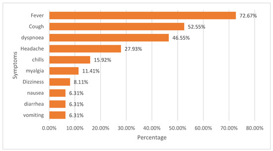 Fever was the most reported symptom (72.67%) among the selected subjects, with cough and dyspnea coming in second and third place, respectively (Figure 2). Headache, chills, and myalgia were reported in 27.93%, 15.92%, and 1.41% of the recruited patients.