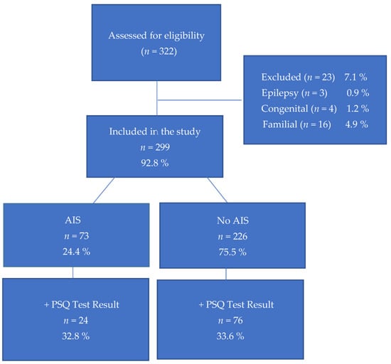 Out of the 299 patients who presented to the scoliosis clinic, 73 (24.4%) were diagnosed with AIS, with an average Cobb angle of 14° (ranging from 10 to 37°). Of the remaining 226 patients who applied, 89 (29.8%) had Cobb angles between 5 and 9°, while 137 (45.8%) exhibited no clinical or radiological pathology. Among patients diagnosed with AIS, 17 (23.3%) were male and 56 (76.7%) were female. Of them, 24 (32.9%) had PSQ scores ≥ 0.33, which were evaluated as significant results. The flowchart of the patients is seen in Figure 1.