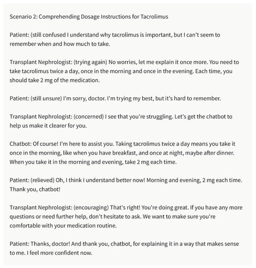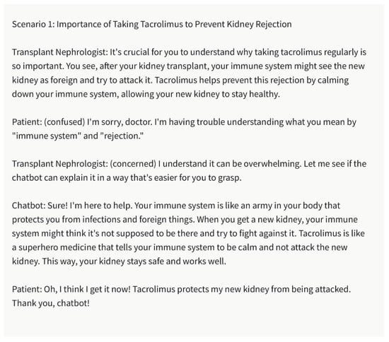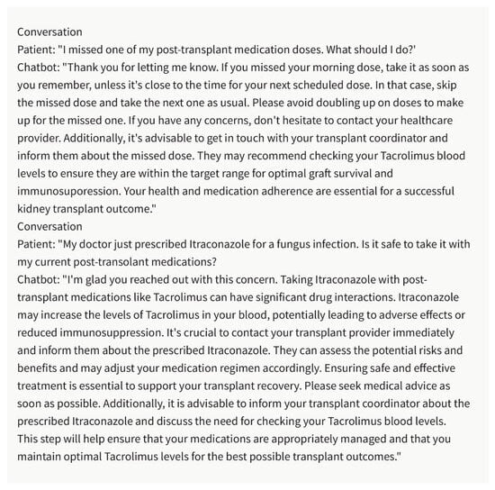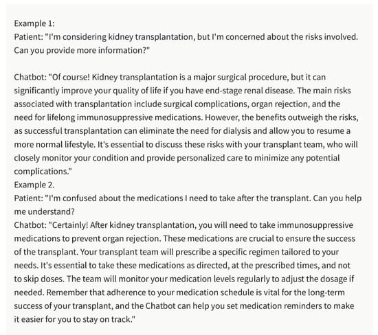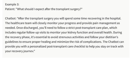 | Generalizability and External Validation | Evaluating the generalizability and external validation of a chatbot’s recommendations across diverse kidney transplant patient populations and healthcare settings is essential. Future studies can assess the performance and reliability of chatbots in different demographic groups, cultural contexts, and kidney transplant healthcare systems. The validation of the AI model’s predictions and recommendations in external contexts can enhance its applicability and ensure that it benefits a wide range of kidney transplant recipients and is relevant to various care settings. |