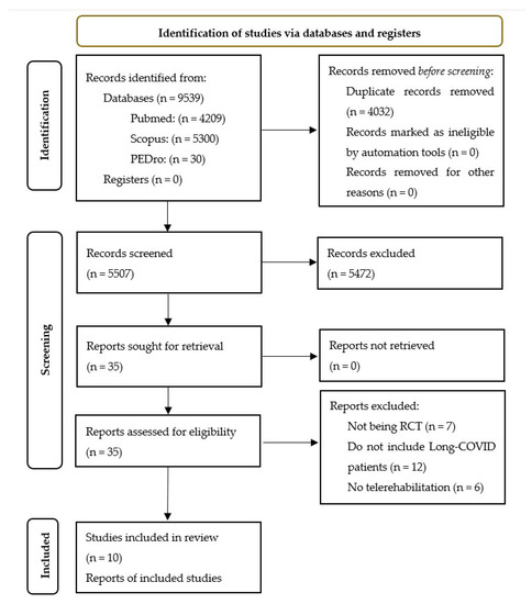 Medline (via Pubmed): (“post-acute COVID-19 syndrome” OR “post-acute COVID syndrome” OR “long-COVID” OR “long COVID” OR “long-haul COVID” OR “long haul COVID” OR “persistent COVID-19” OR “long hauler COVID” OR “post-acute sequelae of SARS-CoV-2 infection” OR “chronic COVID syndrome” OR “post-COVID” OR “post COVID” OR “long-term COVID-19” OR “post-COVID syndrome” OR “post-COVID-19 syndrome” OR “post COVID-19 condition” OR “post-COVID-19 condition” OR “post-COVID-19 conditions” OR “post-COVID conditions” OR “post-COVID condition” OR “COVID-19 persistent symptoms” OR “COVID-19 consequences” OR “Ongoing symptomatic COVID-19”) AND (“Physical Therapy Modalities” OR “modalities, Physical Therapy” OR “modality, Physical Therapy” OR “physical Therapy Modality” OR “physiotherapy (Techniques)” OR “physiotherapies (Techniques)” OR “physiotherapy” OR “physical” OR “therapy” OR “therapies” OR “physical Therapy Techniques” OR “physical Therapy Technique” OR “techniques, Physical Therapy” OR “group Physiotherapy” OR “group Physiotherapies” OR “physiotherapies, Group” OR “physiotherapy, Group” OR “physical Therapy” OR “physical Therapies” OR “therapy, Physical” OR “neurological Physiotherapy” OR “physiotherapy, Neurological” OR “neurophysiotherapy” OR “Physical Therapy Specialty” OR “Specialty, Physical Therapy” OR “Therapy Specialty, Physical” OR “Physiotherapy Specialty” OR “Specialty, Physiotherapy” OR “Rehabilitation” OR “Habilitation” OR “Exercise Therapy” OR “Remedial Exercise” OR “Exercise, Remedial” OR “Exercises, Remedial” OR “Remedial Exercises” OR “Therapy, Exercise” OR “Exercise Therapies” OR “Therapies, Exercise” OR “Rehabilitation Exercise” OR “Exercise, Rehabilitation” OR “Exercises, Rehabilitation” OR “Rehabilitation Exercises” OR “activity” OR “activities” OR “exercise” OR “training” OR “Exercise Movement Techniques” OR “Movement Techniques, Exercise” OR “Exercise Movement Technics” OR “Pilates-Based Exercises” OR “Exercises, Pilates-Based” OR “Pilates Based Exercises” OR “Pilates Training” OR “Training, Pilates” OR “Telerehabilitations” OR “Tele-rehabilitation” OR “Tele rehabilitation” OR “Tele-rehabilitations” OR “Remote Rehabilitation” OR “Rehabilitation, Remote” OR “Rehabilitations, Remote” OR “Remote Rehabilitations” OR “Virtual Rehabilitation” OR “Rehabilitation, Virtual” OR “Rehabilitations, Virtual” OR “Virtual Rehabilitations”)