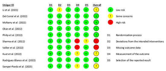 This systematic review evaluated the methodological quality of the studies using the Downs and Black quality assessment method. Of the studies included, one was classified as excellent [38], while seven were classified as good [37,39,40,41,44,45,46], one was classified as fair [43], and one was classified as poor [42]. Additionally, the risk of bias of all ten studies [37,38,39,40,41,42,43,44,45,46] was assessed using the RoB-2 tool (Figure 2), which concluded that five of the articles had a low risk of bias [38,39,40,41,45], three of them had some concerns [37,44,46], and two others had a high risk of bias [42,43]. These findings suggest that most of the studies included in this review were conducted with rigorous methodology.