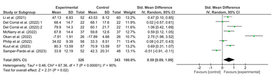 The results obtained in the meta-analysis with respect to quality of life were analyzed as shown in Figure 3. The pooled standardized mean difference (SMD) showed a significant overall effect of respiratory telerehabilitation compared to the comparator groups (SMD = 0.59; 95% CI = 0.09; 1.09; p = 0.02). The results showed heterogeneity, detecting a significant variability of I2 = 90%, not attributable to chance.