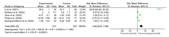 Figure 4 shows the results obtained in the meta-analysis for dyspnea. The pooled standardized mean difference (SMD) showed a significant overall effect of respiratory telerehabilitation compared to the comparator groups (SMD = 4.95; 95% CI = 2.81; 7.08; p < 0.00001). The results show heterogeneity, detecting a significant variability of I2 = 98%, not attributable to chance.