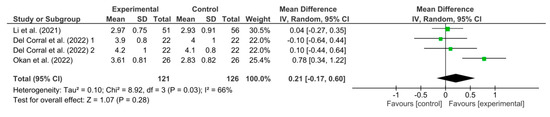 Figure 5 shows the results obtained in the meta-analysis for FVC. The pooled mean difference (MD) showed a non-significant overall effect of respiratory telerehabilitation compared to the comparator groups (MD = 0.21; 95% CI = −0.17; 0.60; p = 0.28). The results show heterogeneity, detecting a significant variability of I2 = 66%, not attributable to chance.