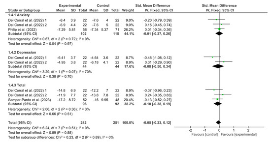 Figure 6 shows the results obtained in the meta-analysis for anxiety and depression. The pooled standardized mean difference (SMD) showed a non-significant overall effect of respiratory telerehabilitation compared to the comparator groups (SDM = −0.05; 95% CI = −0.23; 0.12; p = 0.55). The results do not show heterogeneity, detecting a significant variability of I2 = 0%.