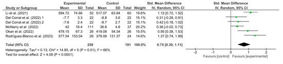 Figure 8 shows the results obtained in the meta-analysis for functional capacity. The pooled standardized mean difference (SMD) showed a significant overall effect of respiratory telerehabilitation compared to the comparator groups (SMD = 0.75; 95% CI = 0.39; 1.11; p < 0.0001). The results show heterogeneity, detecting a significant variability of I2 = 66%, not attributable to chance.