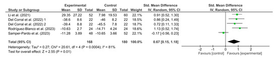 Figure 9 shows the results obtained in the meta-analysis for lower limb strength. The pooled standardized mean difference (SMD) showed a significant overall effect of respiratory telerehabilitation compared to the comparator groups (SMD = 0.67; 95% CI = 0.15; 1.18; p = 0.01). The results show heterogeneity, detecting a significant variability of I2 = 81%, not attributable to chance.