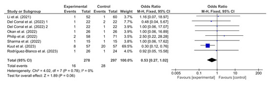 Figure 10 shows the results obtained in the meta-analysis for adverse events. The result shown by this meta-analysis (OR = 0.53; 95% CI = 0.27; 1.02; p = 0.06) means that the difference between the groups exposed to telerehabilitation and the comparison groups is not statistically significant, implying that there is no strong evidence of an association between telerehabilitation and adverse effects.