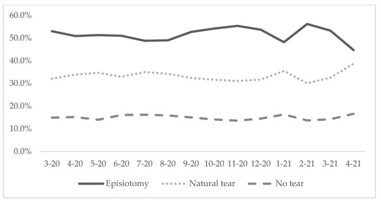 Prevalence of episiotomy, natural tear and no tear in four hospitals from March 2020 to April 2021 (N = 31,541).