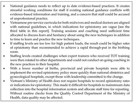 Twelve hospitals participated in the training of trainers, eight hospitals collected and shared their data, and four of these had complete data. Feedback from participating health workers highlighted challenges implementing the new episiotomy policy [29], some of which could be addressed through training while others require larger solutions, as noted in Figure 4.